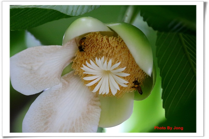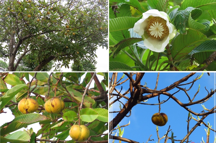 花單生於枝頂葉腋內,花瓣白色,倒卵形;果實圓球形,因果實碩大,落果期間應避免樹下走動+黑冠麻鷺。 花單生於枝頂葉腋內,直徑約 12~20 公分,花梗粗壯,被毛;萼片 5 個,肥厚肉質,近於圓形,直徑 3~6 公分,外側有柔毛,花瓣白色,倒卵形,長 7~9 公分;雄蕊發育完全,外輪數目很多,內輪較少且比外輪長,無退化雄蕊,花藥長於花絲,頂孔裂開;心皮 16~20 個,花柱線形,頂端向外彎;胚珠每心皮多個。果實圓球形,直徑 10~15 公分,不裂開,宿存萼片肥厚,稍增大;種子壓扁,邊緣有毛。第倫桃因其果實碩大,在冬末春初的落果期間,重約 1 公斤之堅硬熟果自 10 公尺以上的樹上掉落,十分危險,應避免於樹下走動。