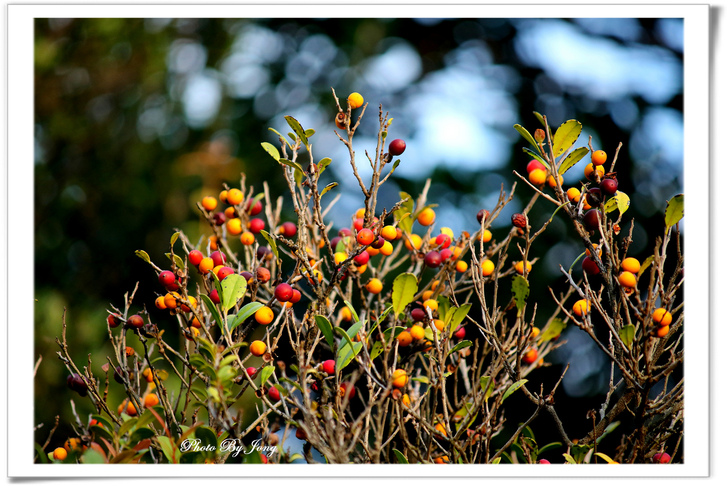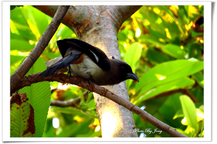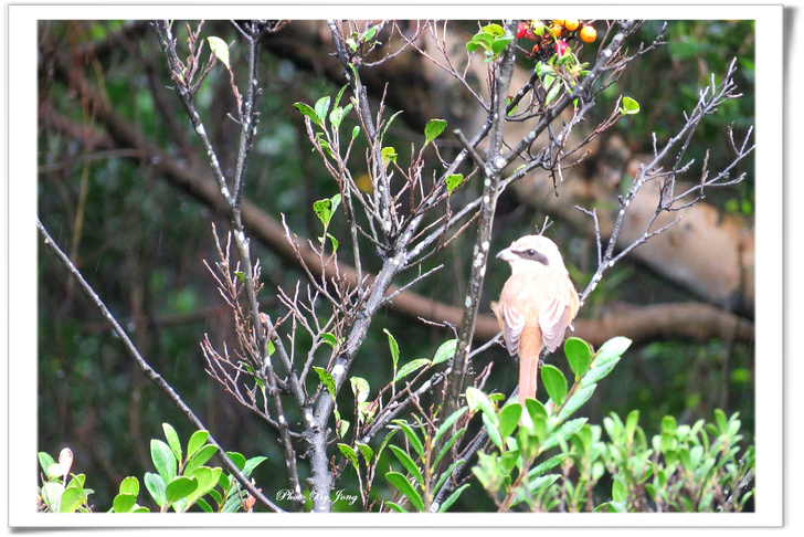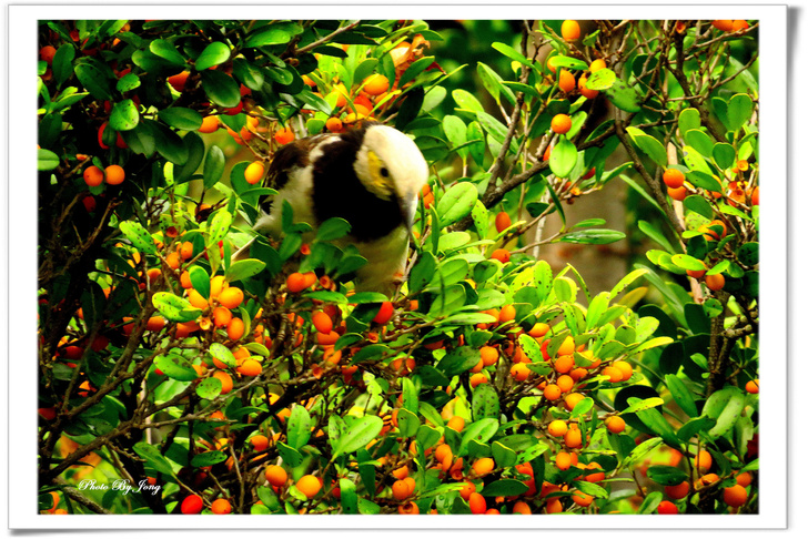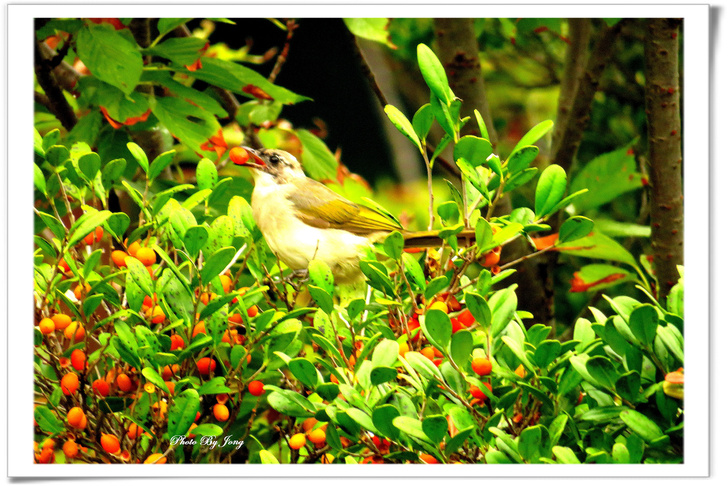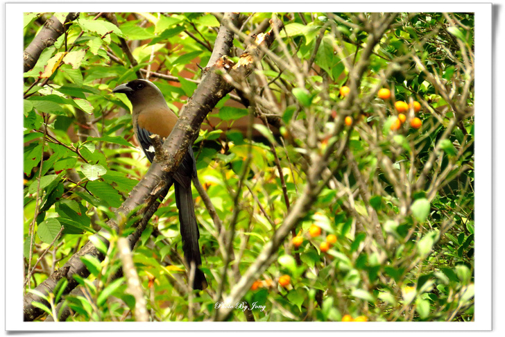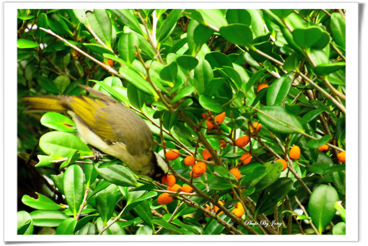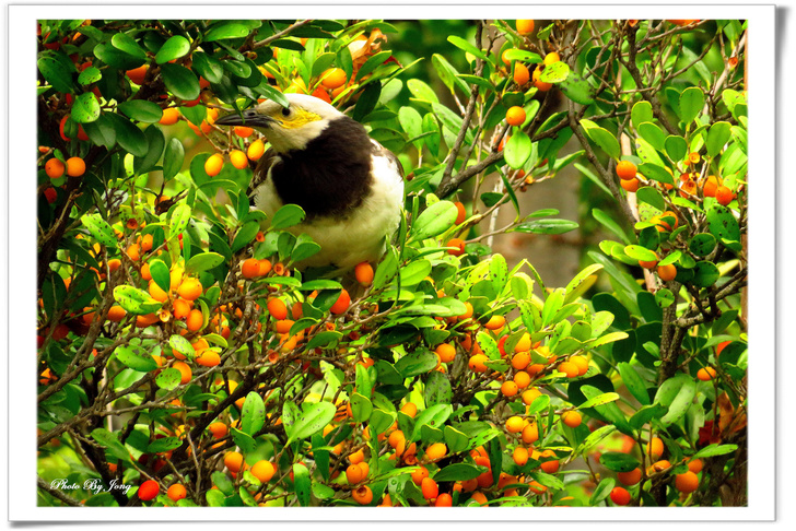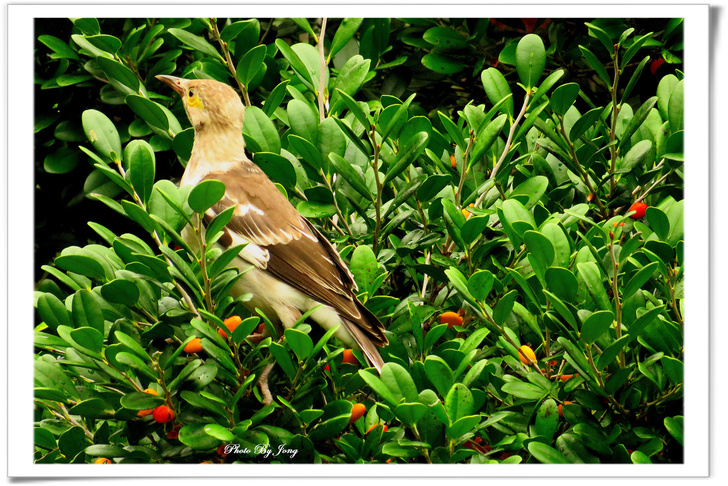 象牙樹果+樹鵲+紅尾伯勞。 八、九月間,正是象牙木結滿黃果子趨紅成熟的時間,遇到巧時,就會發現不同種類的鳥兒飛來徘徊停留及品嚐。陸續發現的鳥兒最多的是白頭翁,其他的鳥兒則發現有五色鳥、黑領椋鳥(黑脖八哥)、家八哥、樹鵲、伯勞鳥等。但常見愛吃樹果的綠繡眼卻仍未能得見。不過,或許,果子還不夠成熟,待果子再軟爛些,綠繡眼也會出現吧。 附錄—第倫桃、象牙木基本資料