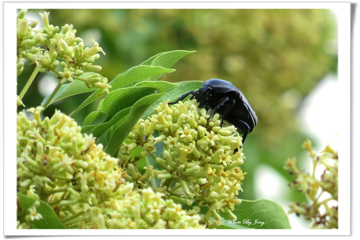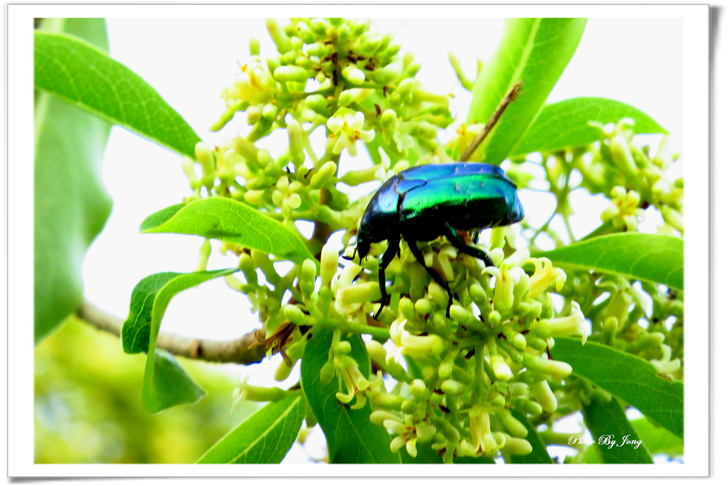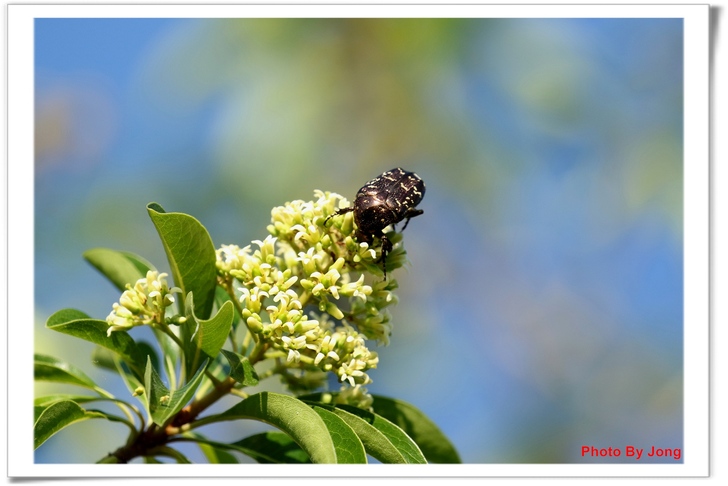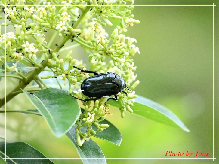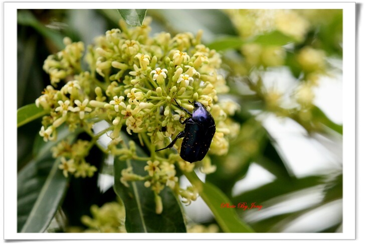 台灣海桐花+東方白點花金龜+細腳騷金龜+暗藍扁騷金龜+銅艷白點花金龜+藍艷白點花金龜。 海桐科(Pittosporaceae)海桐屬(Pittosporum)的台灣海桐,別稱七里香、雞榆、十里香。正常時間七、八月間枝頭會開出密集成串的小白花(但因大環境天候變化,也見入秋開花),一如其別名,花香遠播,因此會吸引許多聞香而來的蜂、蝶及昆蟲來拈花採蜜。