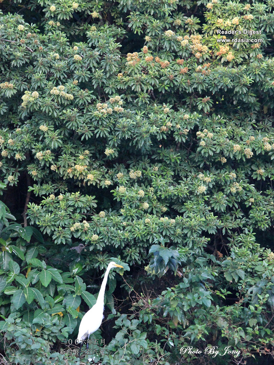 台灣海桐花+紅嘴黑鵯+大白鷺+中白鷺+小白鷺。 我曾在網誌發表「<旅遊花樹記事>台灣海桐 蜂蝶聞香來」,當時,因題材限制,並沒有將鳥、蛾及金龜子列入;其實陸陸續續在不同的場域都會有新的發現。並補拍到新的蜂、蝶訪客不少;因為數位網誌的方便修改增補的特性,因此,事後也還有持續的調整更新。 台灣海桐樹姿具觀賞價值,可作為庭園觀賞樹及行道樹用;也常被種為水岸邊及海岸當作防風林,因此廣佈在海濱及平原闊葉林中。因此可說是水岸及低海拔山區都適於栽種的植物。