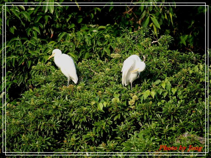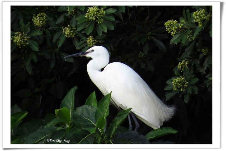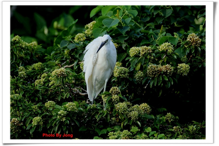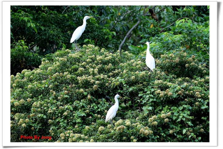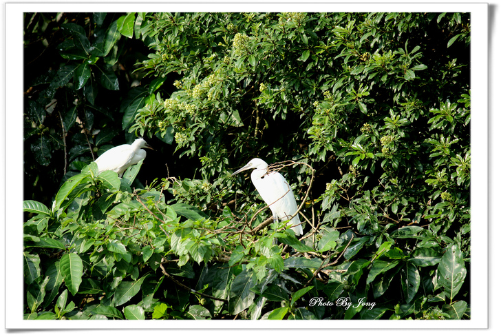 我因為有機會在都會的園林、池塘及河邊走動,因此不只發現愛食果子及蟲的白頭翁、綠繡眼、五色鳥、紅嘴黑鵯、樹鵲、麻雀等會飛來台灣海桐的枝頭入鏡;就連常在水邊活動的鳥禽,如:小白鷺、中白鷺、大白鷺及夜鷺,也會因就近水岸的花樹停棲而入鏡。