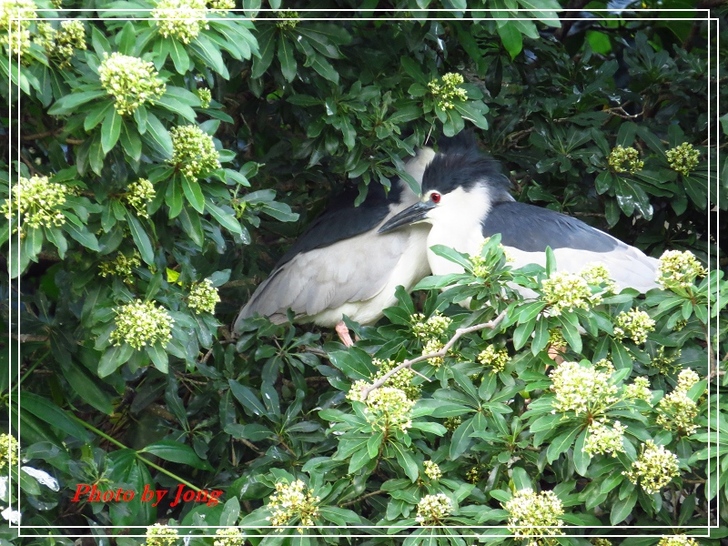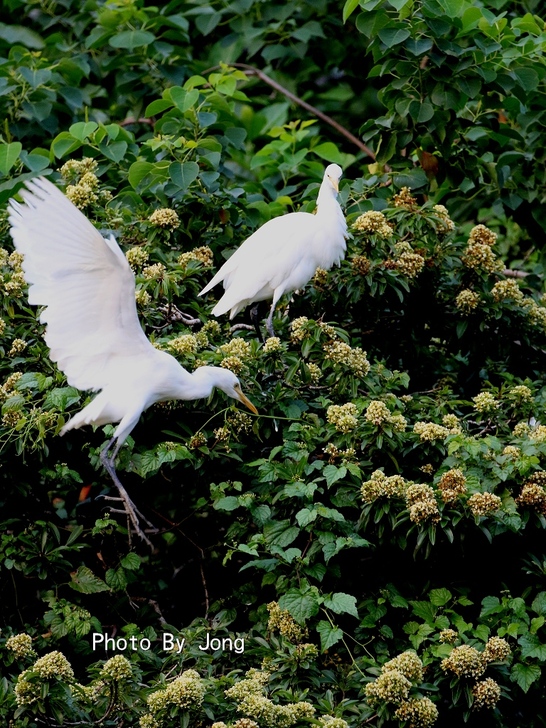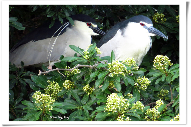 台灣海桐花+黃頭鷺、夜鷺、夜鷺幼、白頭翁。 我因為有機會在都會的園林、池塘及河邊走動,因此不只發現愛食果子及蟲的白頭翁、綠繡眼、五色鳥、紅嘴黑鵯、麻雀等會飛來台灣海桐的枝頭入鏡;就連常在水邊活動的鳥禽,如:小白鷺、中白鷺、大白鷺及夜鷺,也會因就近水岸的花樹停棲而入鏡。