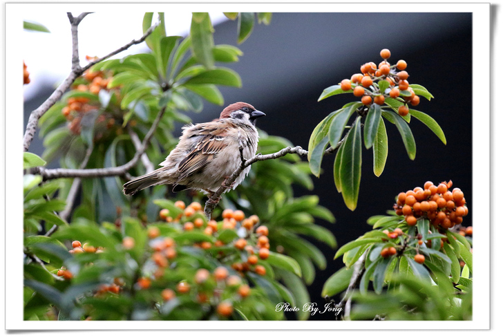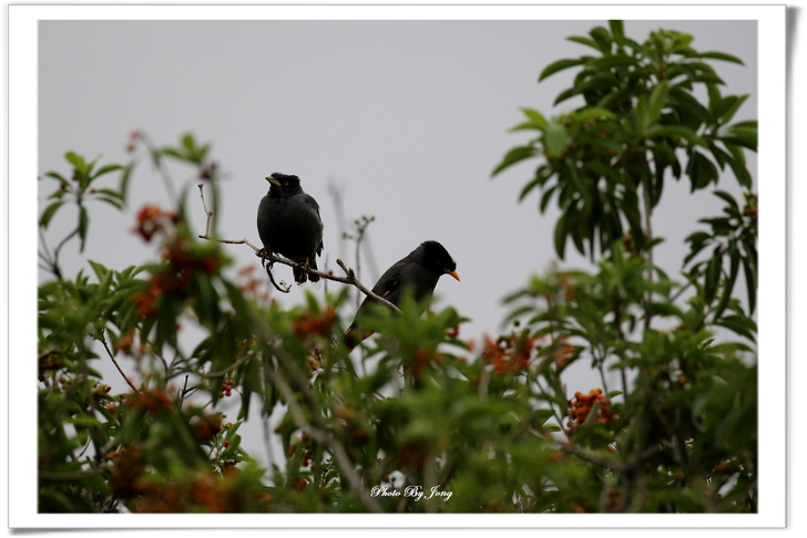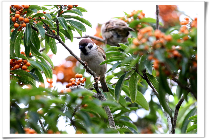 台灣海桐果+綠繡眼+麻雀+白尾八哥、本土八哥。 台灣海桐,名字中有「海」字,相關資料顯示,具有耐鹽性以及耐強風的特性,因此,頗適合種植海邊;可惜,個人迄今尚無機會發現海岸栽植的台灣海桐,如果有機會,屆時,或許還會有更多海邊生物與花樹相伴的驚喜發現吧。