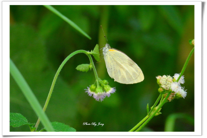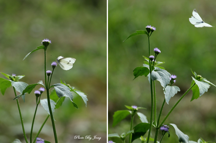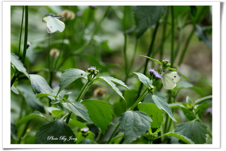 貓腥草+白粉蝶。 另外,菊科澤蘭屬的貓腥草,別名:貓腥菊,假臭草、假藿香薊、紫莖澤蘭。與紫花藿香薊相似,一般人乍看還很難辨識,也常見於路邊、廢耕地及水邊。葉片卵圓形至長菱形(紫花藿香薊葉片鈍三角形或心形),葉鋸齒數約6對(紫花霍香薊10對)。花較小,花序較疏,看起來分散,頭狀花總苞的高大於寬。 藿香薊花比較大又密集,頭狀花總苞的高小於寬。花冠長約 0.35~0.48 公分(紫花藿香薊花冠長 0.25~0.35 公分),外層苞片鐘狀圓柱形(藿香薊總苞片 2 層,狹披針形)。