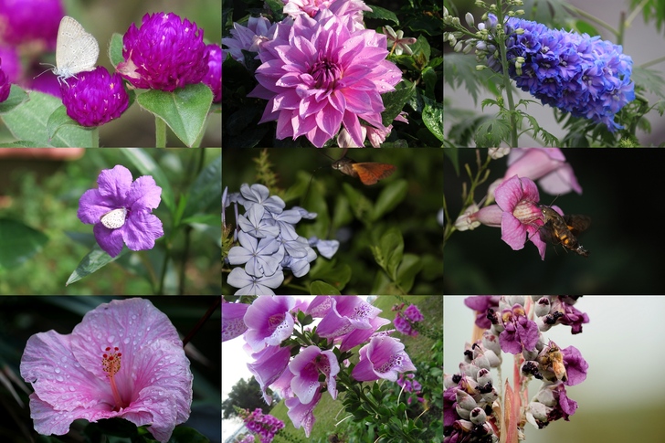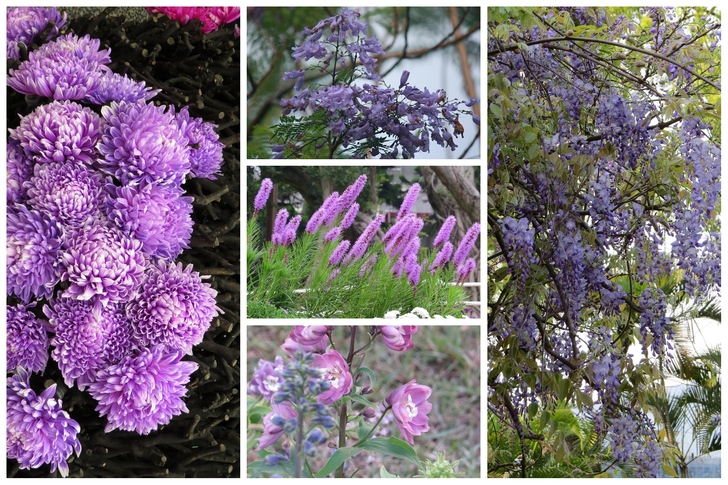 紫色的花如玫瑰(紫星)、菊花、藍楹花、大飛燕草、紫藤等,為數眾多。 植物的花花世界,本就是姹紫嫣紅,百花競放,多彩多姿,爭奇鬥艷,尤其在今日農業科技及園藝發達培育之下,各種花朵的色彩真是繽紛,紅、橙 、黃、綠、藍、靛、紫幾乎無所不包。近年甚至連多色混合的玫瑰,接近黑色的花朵也都被有心人培養出來,讓愛花賞花人不能不眼界大開?當然,也不妨打開胸襟,不必再被侷限於一尊,可以從不同的角度來欣賞眾花之美了。