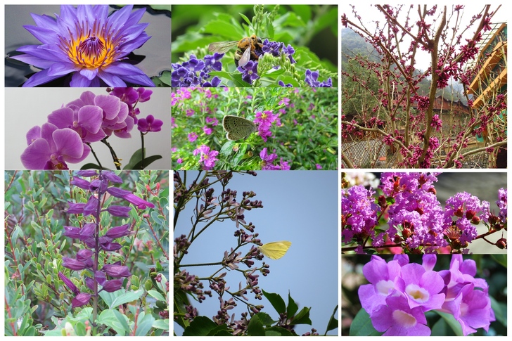 紫色的花如睡蓮、蘭花、一串紅、金露花、雪茄花、苦楝、紫荊花、紫薇、蒜香藤、圓仔花、翠蘆莉、扶桑等,為數眾多。 紫色一般指由紅色和藍色混合而成的顏色,英語稱為Purple,但同是紫色,是紅多或藍多?層次偏紅或偏藍?似乎仍然有許多不同色調吧。花花世界,紫色的花真是為數眾多,僅就個人在網誌曾報導過的花樹粗略回顧,就有玫瑰、菊花、藍楹花、大飛燕草、紫藤、睡蓮、蘭花、一串紅、金露花、雪茄花、苦楝、紫荊花、紫薇、蒜香藤(紫鈴藤)、圓仔花、翠蘆莉、扶桑、大理花、藍雪花、毛地黃、紫雲藤、水竹芋、九重葛、馬櫻丹…..,當然還有更多的紫色花朵,有待逐一去發現並體察其中的奧妙吧。