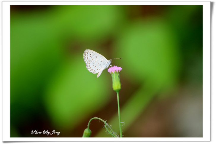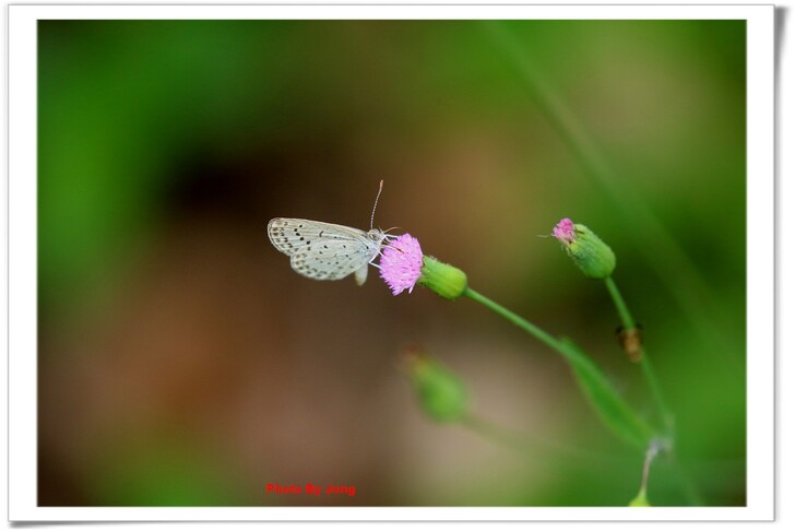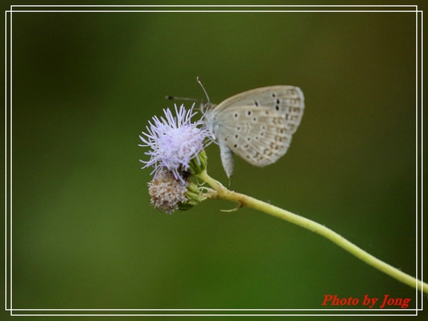 紫背草+藍灰蝶。 紫背草(Red Tasselflower)是菊科(Compositae)紫背草屬(Emilia),別名:一點紅、紅背葉、羊蹄草、野木耳菜、花古帽(貴州)、牛奶奶、紅頭草(雲南)、葉下紅,片紅青,紅背果(海南)、紫背葉(臺灣)、紅背草、牛石菜、牛尾膝、紅背仔、假芥藍、爆仗草、矮腳樟、文武狀元、喇叭紅草、小蒲公英、土黃連、野芥藍、紫背犁頭草。