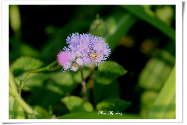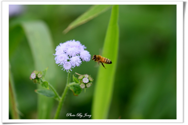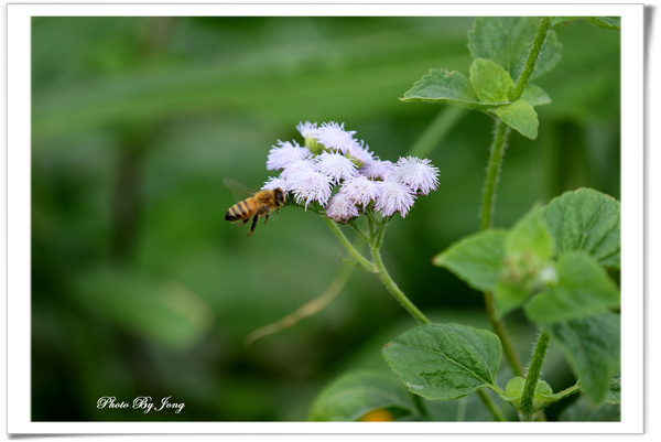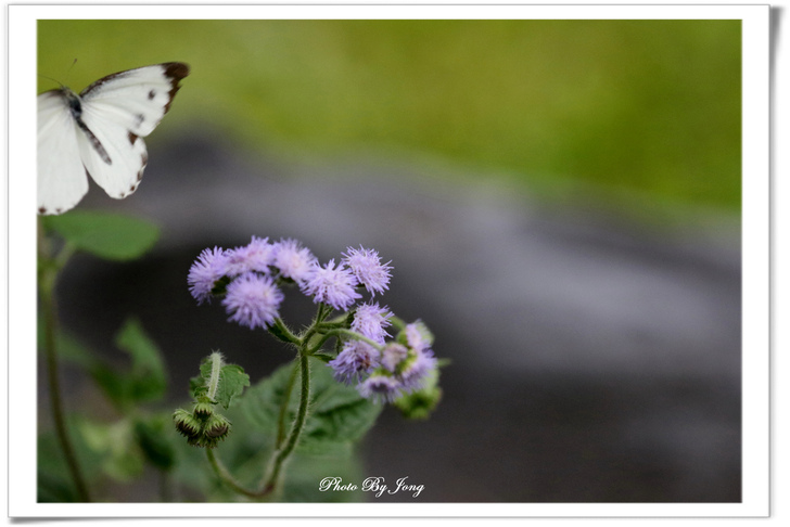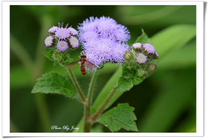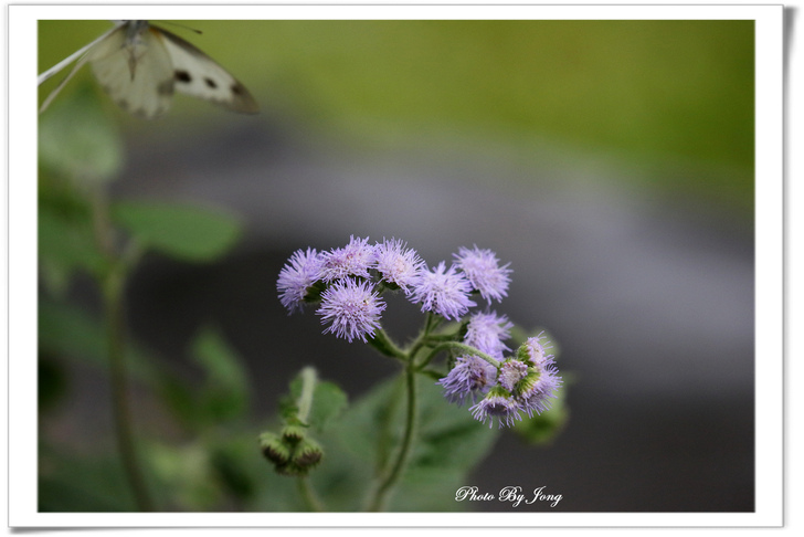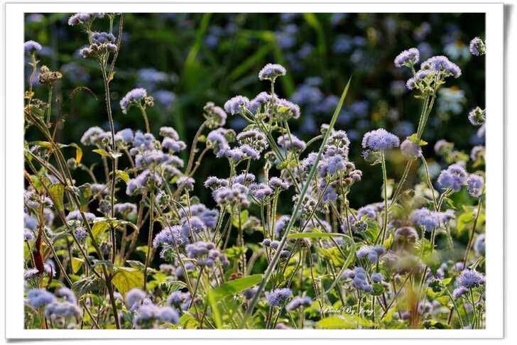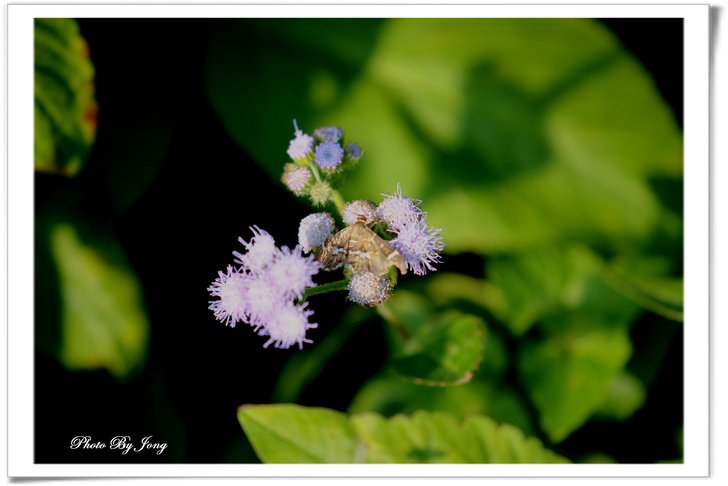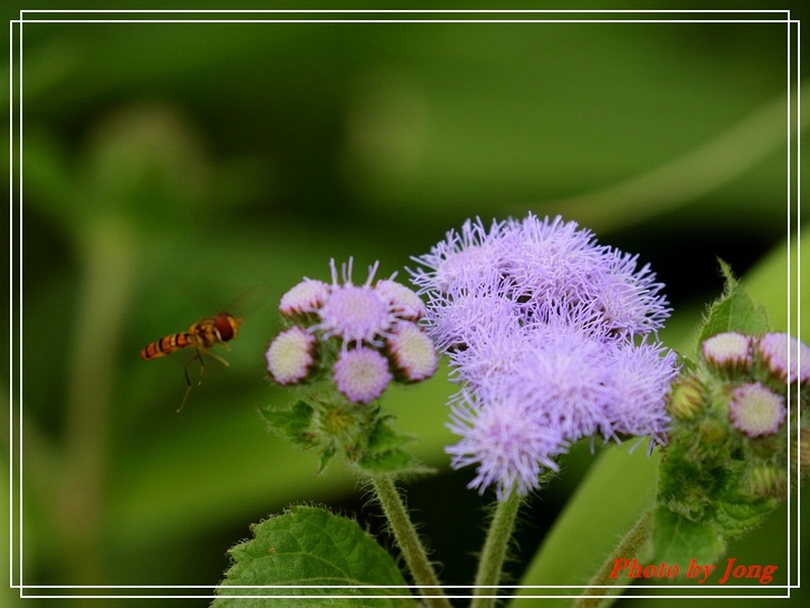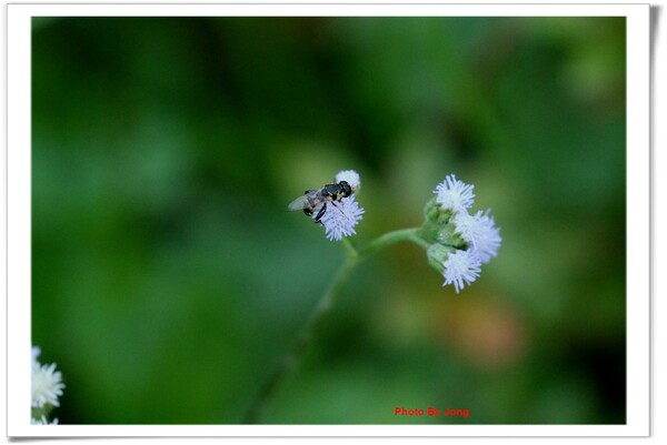 紫花藿香薊+藍灰蝶+西洋蜂、貓腥草+食蚜蠅、紫背草+白粉蝶、嶺南野菊+豆波灰蝶。 菊科小花 蜂蝶野趣 不僅在花展、庭園有「備受關愛」的名貴紫花,就連在路邊、田邊、河邊無人照管的荒郊野地裡,即使11月~12月間也時常可以同時發現好幾種紫色的小野花,經查,分別是紫花藿香薊、貓腥草、紫背草、嶺南野菊。四者巧合的都是菊科家族的成員,或許它們無法登入菊花展的殿堂,但,正因為野生野長,生命力格外強盛。這幾種花草雖是一年生草本,在台灣卻幾乎都是四季皆可開花結果繁衍;開的花雖小卻為數不少,點綴在荒雜的漫草間,卻也自有一番野趣,且對蜂、蝶、昆蟲竟然是媚惑十足。因為在都會井然有序的花園,想看到蜂、蝶飛舞,似乎愈來愈難啦。