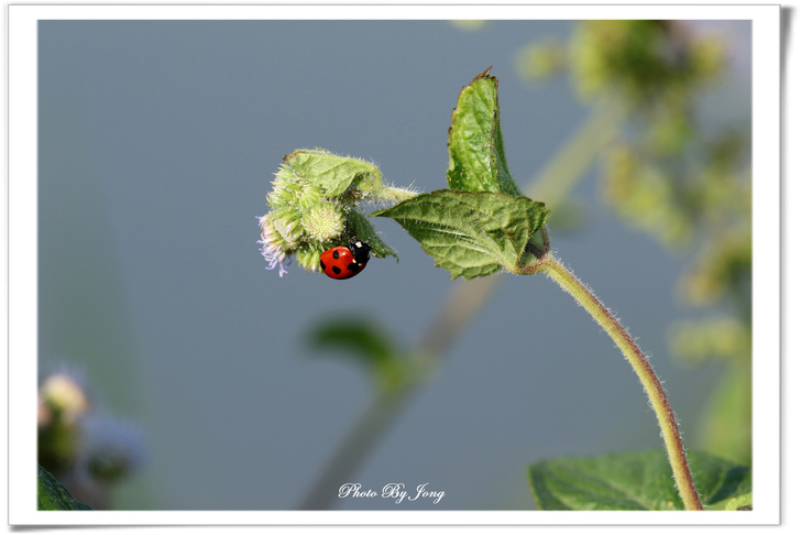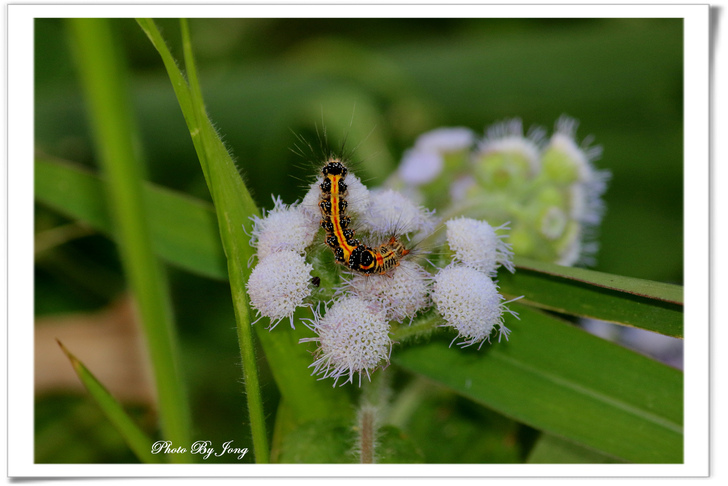 紫花藿香薊+六條瓢蟲+七星瓢蟲+台灣黃毒蛾幼蟲+食蚜蠅。 紫花藿香薊(Floss Flower)是菊科(Compositae)藿香薊屬(Ageratum),別名:紫花毛麝香、墨西哥藍薊、牛屎草、熊耳草。