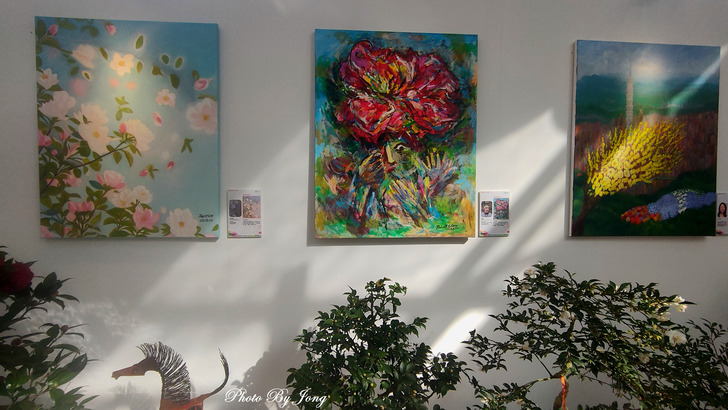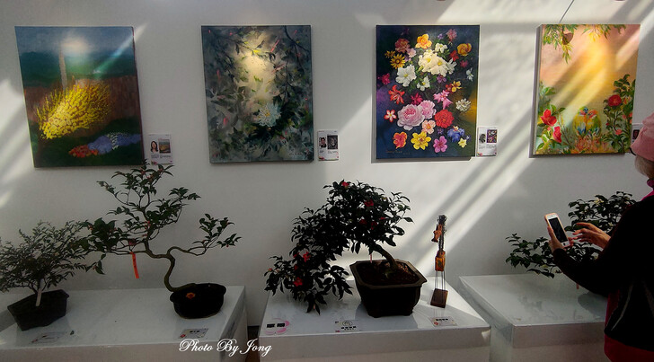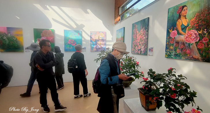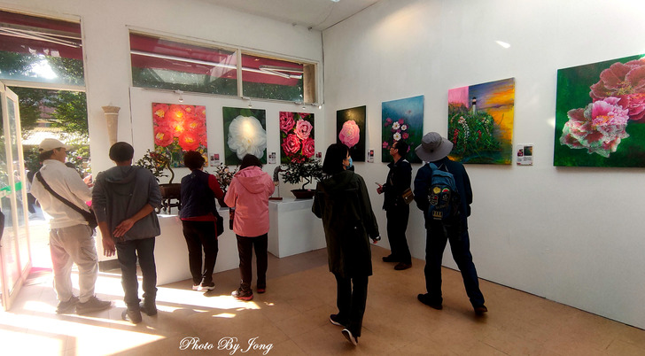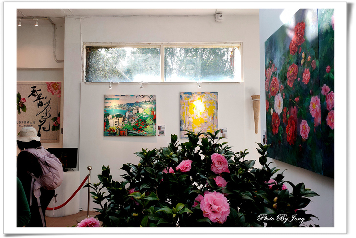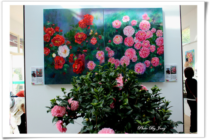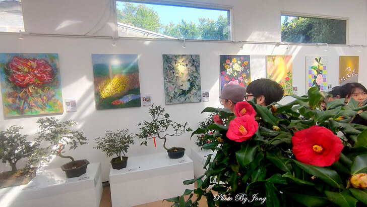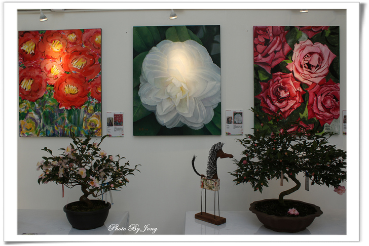 室內展出現場,當然仍有許多知名的茶花盆景參展。 自2019年茶花展「椿之歌」起,在室內展出現場,除了名家培育的盆栽外,還特別邀請了知名的畫家及雕塑家作品來搭配組合展出,別具特色,且行之有年。今年茶花展未如往年命名主題,當然仍有許多知名的茶花盆景參展,難得仍有名家畫作搭配(台灣三E美術會—「花影流年」,與茶花盆景相得益彰),惟雕塑作品已不復見。