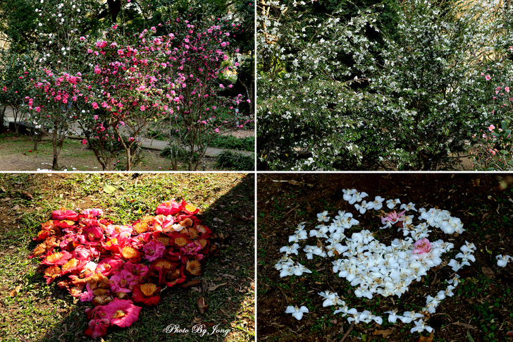 今年茶花展未如往年命名主題,當然仍有許多知名的茶花盆景參展,難得仍有名家畫作搭配(台灣三E美術會—「花影流年」,與茶花盆景相得益彰),惟雕塑作品已不復見。 幸好,園區內的茶花林多種茶花開得十分繁鬧,老梅樹的梅花也花開迎客;園區幾棵早開的河津櫻、白色合歡、楓紅、巴西野牡丹、拎壁龍等,也頗有看頭。