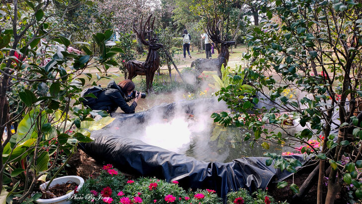茶花林茶花繁鬧,梅花、河津櫻、白色合歡、楓紅、巴西野牡丹、拎壁龍等,也頗有看頭。蠟梅,尤其讓遊園賞花人見獵心喜搶拍。 幸好,園區內的茶花林多種茶花開得十分繁鬧,老梅樹的梅花也花開迎客;園區幾棵早開的河津櫻、白色合歡、楓紅、巴西野牡丹、拎壁龍(又名白珠藤、風不動藤)等,也頗有看頭。還有難得一見的蠟梅,尤其讓遊園賞花人見獵心喜搶拍。