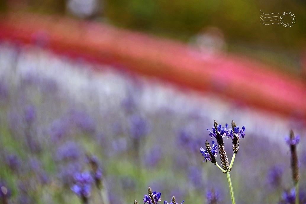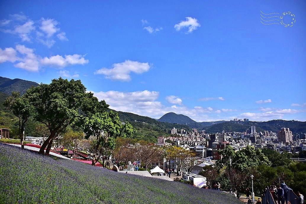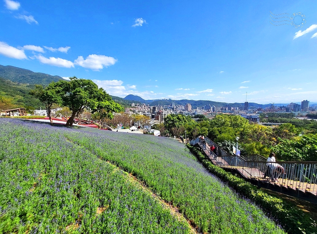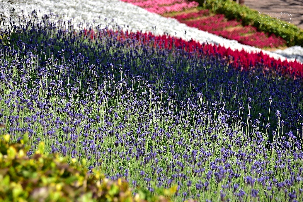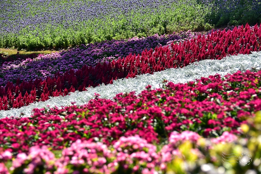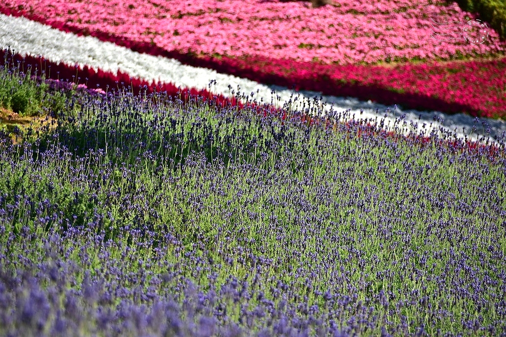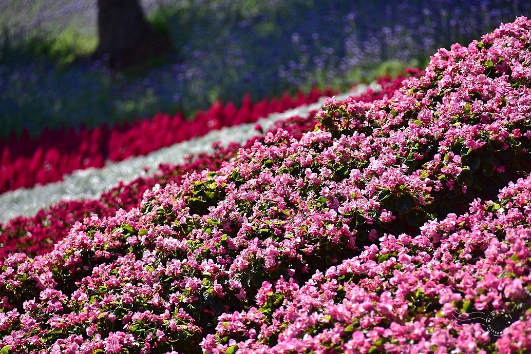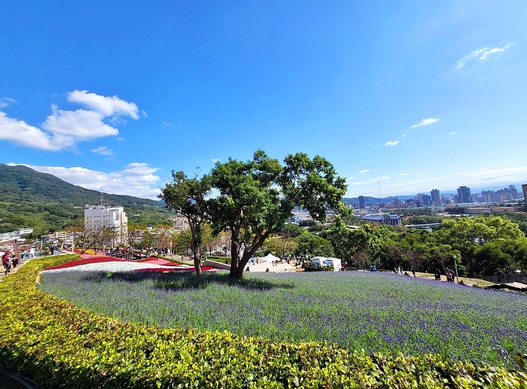 熟悉的富良野風彩虹花海又在眼前開展,浮雲淡淡,天氣超完美。 花海設計一如往年,以兩棵大樹區分薰衣草與彩虹區。 ↓可以俯瞰都市景觀的花海,絕無僅有。