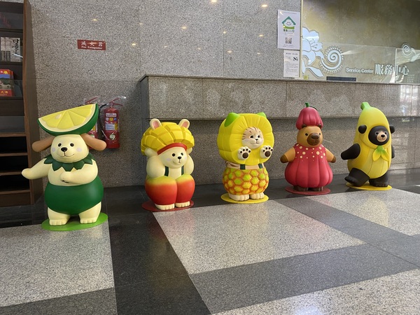 一進縣府大廳,排排站的「人氣五公仔」吸引了眾人目光。擅長木雕的日本藝術家Akane以可愛動物造型融合屏東在地的水果元素,創作「香蕉酷COOL」、「蓮霧蹦BUMP」、「檸檬狗GO」、「鳳梨漾YOUNG」及「芒果醬JUMP」五隻萌系公仔。 充滿童趣的造型大偶,於二○二五夏日狂歡祭結束之後,移師潮州日式園區展出,半人高的小公仔,則留守縣府迎賓。 115年3月3日人間福報家庭版【生活快門】水果公仔sweet https://www.merit-times.com.tw/NewsPage.aspx?unid=929721 |