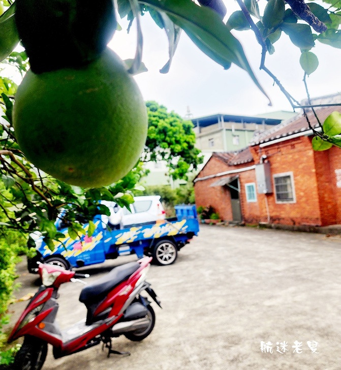 生活場景裡的柚子,紅磚屋、藍色小貨車、機車與樹影,把中秋的味道和日常生活連在一起,特別有鄉土味。