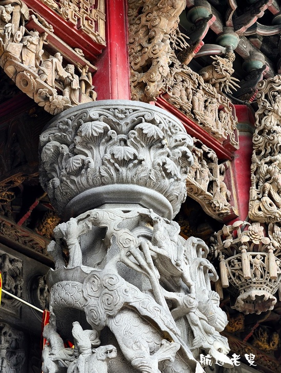 廟前的花崗岩龍柱是工藝的代表作,不只是平面圖案的雕刻,而是採用了高難度的透雕技法。