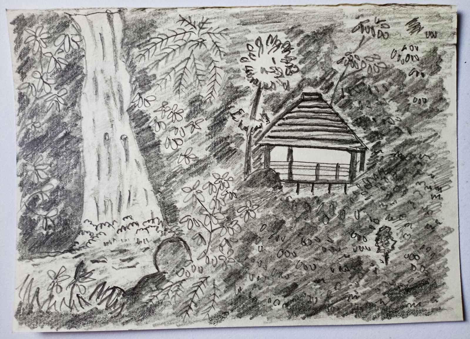 ⬆ 瀑布旁的涼亭 (鉛筆+黃色素描紙)