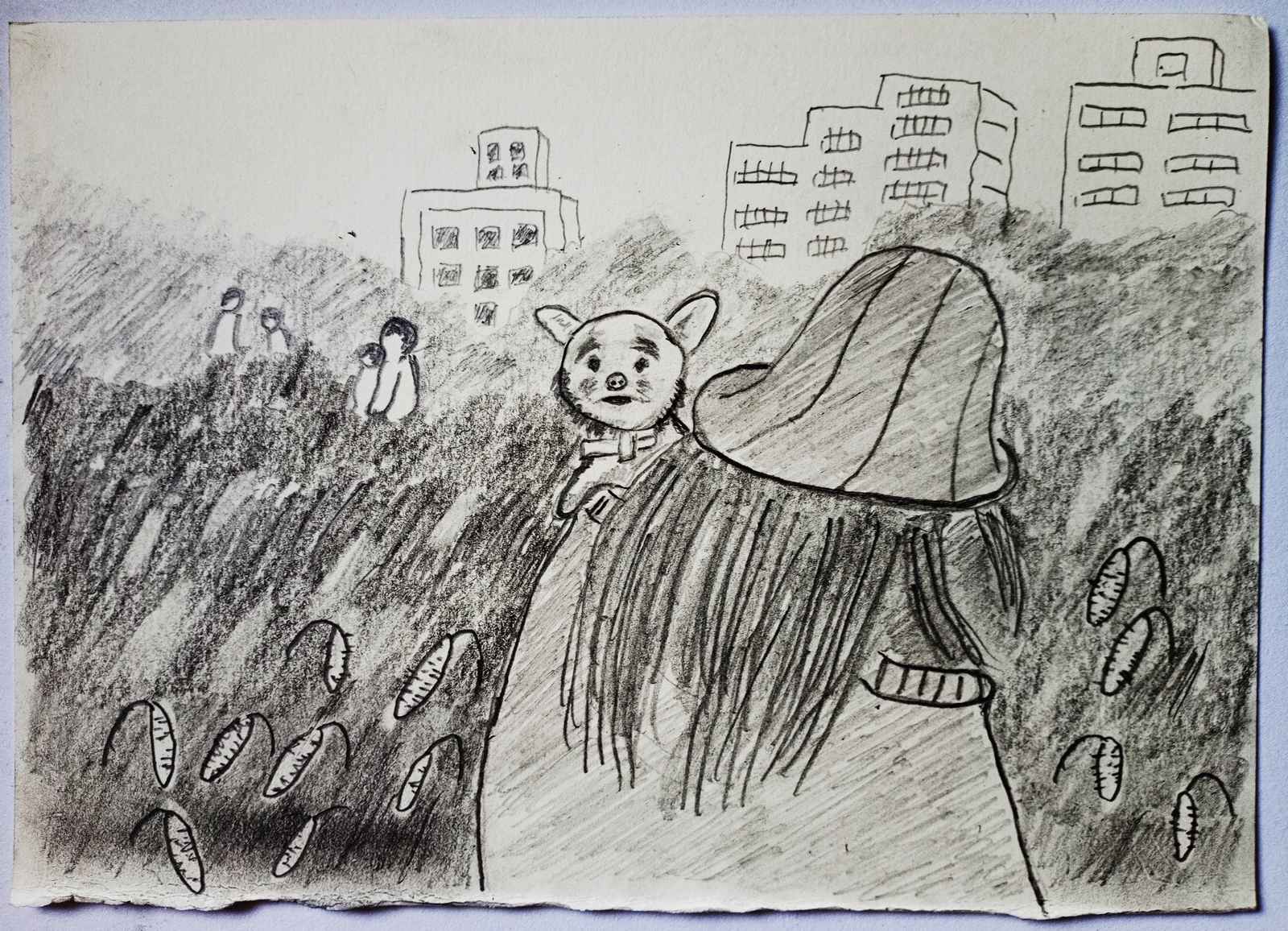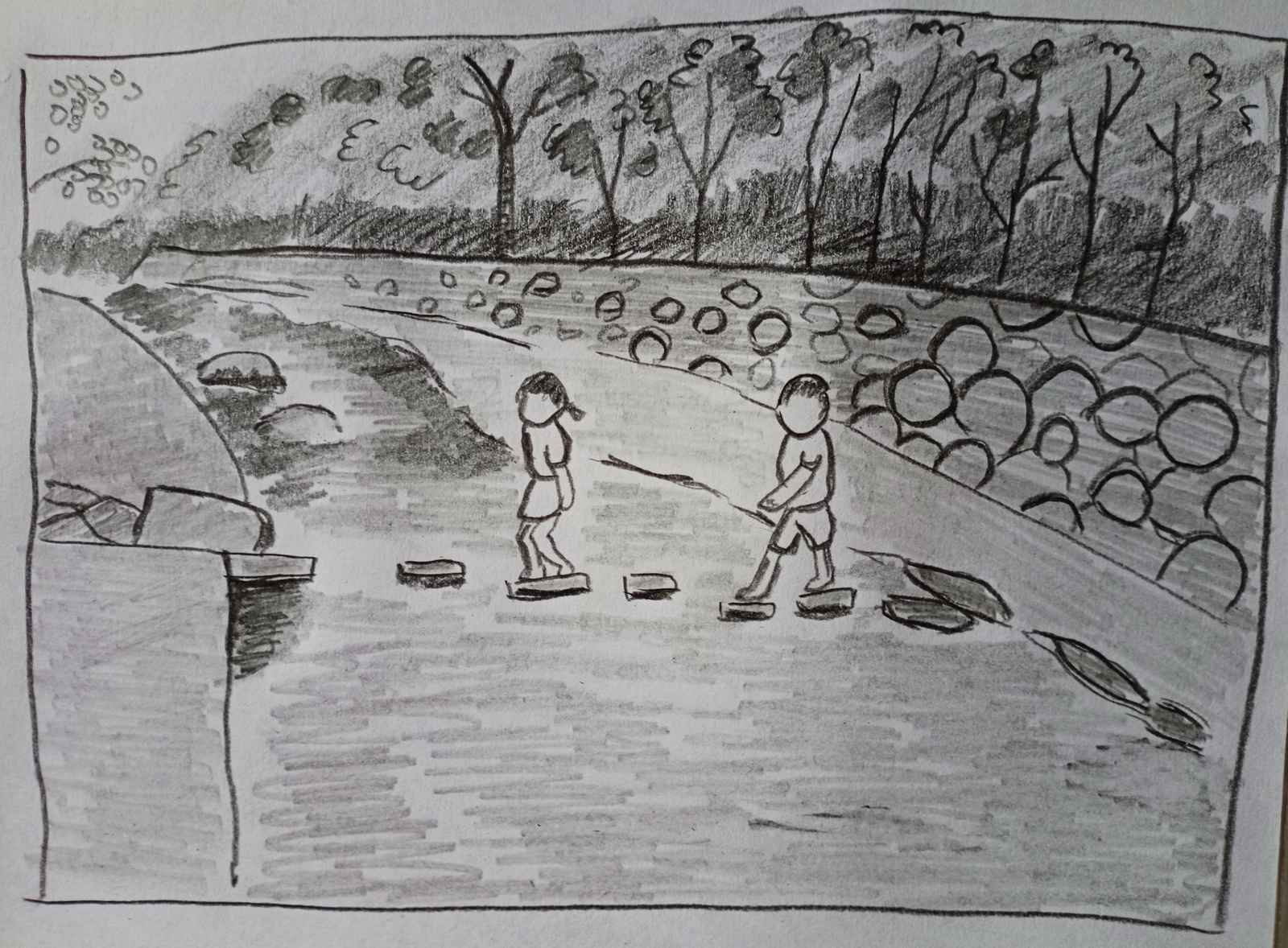 ⬆ 踩著石頭過河的兄妹 (鉛筆+影印紙)