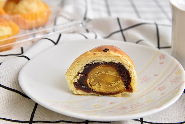 切開的剖面圖~ 吃蛋黃酥最怕太乾,蓁古早味蛋黃酥的鹹蛋黃不會太乾,帶有一點點潤的感覺,配茶很剛好 紅豆餡非常綿密細緻,整體內餡相當扎實飽滿 我覺得最厲害的,是蓁古早味蛋黃酥的外皮超~級酥! 咬下去的口感一級棒,完全不輸中秋禮盒推薦的排隊名店!