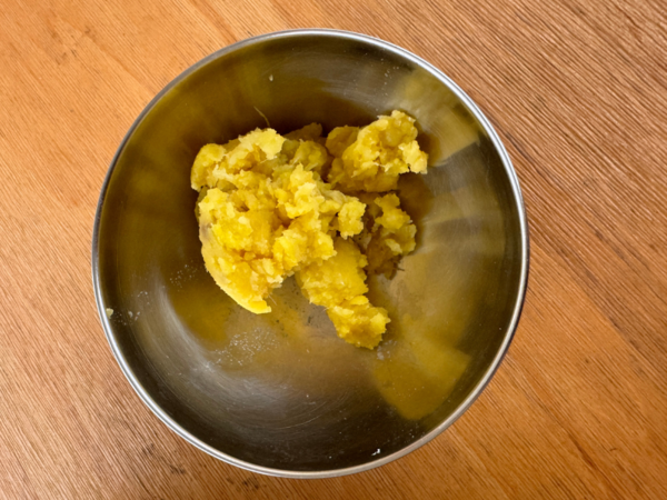 到姐姐家後我們立刻開始準備料理。按照官網上的教學步驟,第一步要先將熟地瓜壓成泥,鋪平在容器底部。