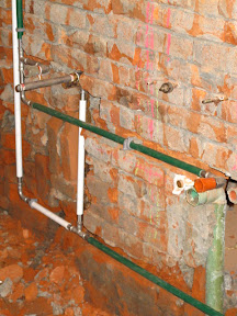 日月神教公主任盈盈位居中和的行館正進行水電工程中的室內冷熱水管更新配置,室內強弱電管路更新移位配管作業。 行館中舊有的給水管路是早期的攻牙鑄鐵管,在拆除浴室牆壁之後可在管路彎頭處發現因為鏽蝕產生明顯的滲漏。並於水龍頭與水管相接處有明顯的鐵鏽堆積與結石。再則水管內排出的水為富含鐵鏽物質的暗紅色的水質。