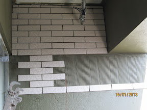 | 樹林吳公館後陽臺二釘掛壁磚施作。 瓷磚:二丁掛壁磚廠牌歐羅麗雅6202 填縫土:金星白水泥填縫土 貼工規格:勾二分之一丁貼法,瓷磚縫寬度約7mm。