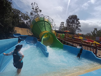 玩到肚餓吃點東西又回來再戰兒童區,她花了很多時間培養勇氣挑戰兒童區所有滑梯,挑戰成功滿心歡喜的玩完又玩,總之她就是不願離開,後來我又花了很多唇舌說服她陪我玩成人區的一款水泡滑梯(她可以玩的滑水道不多),本來她是不情不願的,但因為實在刺激,她一玩完就超興奮的說我沒有介紹錯,然後一玩再玩。