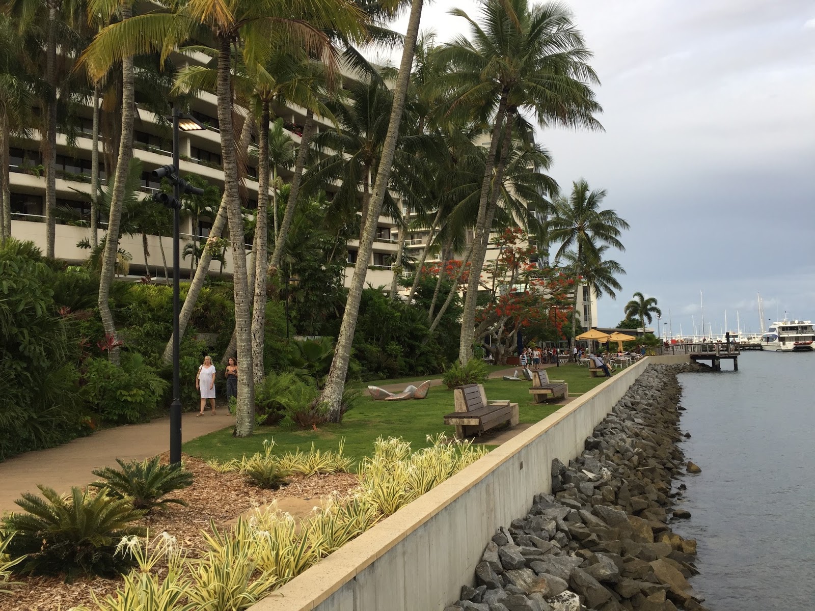 在酒店游水時,發現為這次行程專買的潛水相機壞了,後來發現相機底部有一條裂縫,入水了,我猜應該是我們在機場等的士時,不小心將手袋跌在地上時撞裂了,我不心痛相機壞了,但是我買潛水相機的最大目的就是要在開恩茲玩水上活動時拍照,沒有了相機無法拍照才是最令我氣憤,怎麼辦呢,上網研究過開恩茲有甚麼店可以買或租相機,都說今天聖誕節休息,那也沒辦法,在酒店內激氣無用,一於外出逛逛吧。 開恩茲有許多海上活動,因此碼頭泊滿載遊客出海的遊艇。碼頭就在酒店附近,步行大概十分鐘吧,我們沿著海邊步行至碼頭,路經一個小公園,女兒當然不錯過任何可以玩的機會,玩了一會就繼續步行,由碼頭再行去Lagoon人工沙灘,沿路一片悠閒,草地上有許多當地人聚集,小孩子在玩耍,大人在聊天,這樣的生活真令人嚮往。
