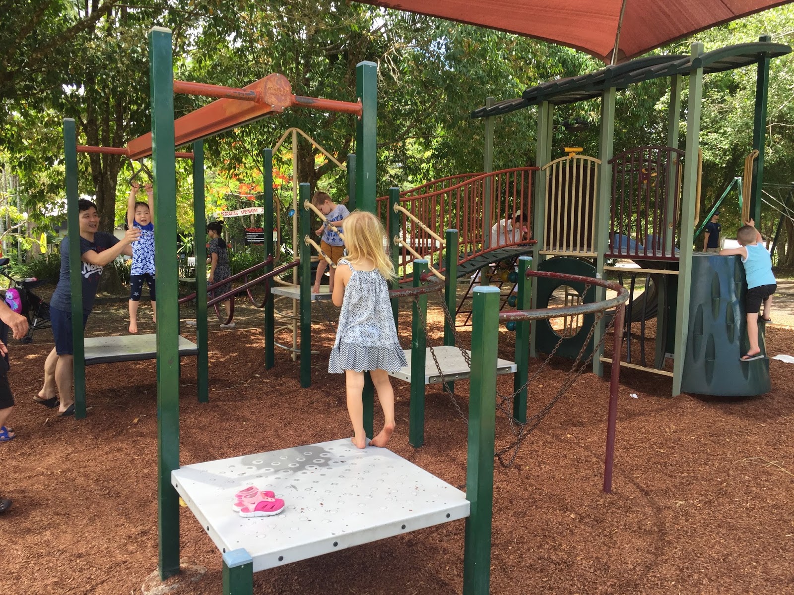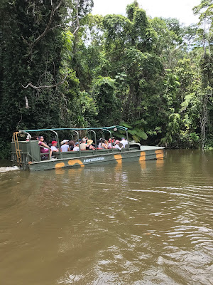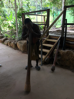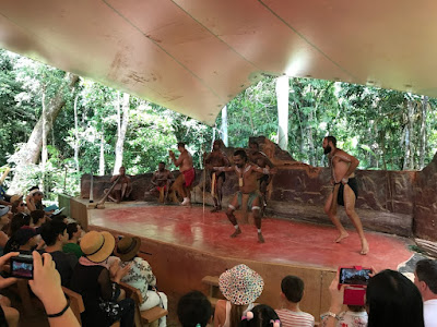 這是全世界最長的纜車,從高空俯瞰熱帶雨林,那一望無際的翠綠令人難忘。由纜車站到庫蘭達小鎮中間有兩個纜車站,我們在第一個站下了車拍照欣賞山景,但想再登上纜車時發現有一條人龍,因此為免耽誤行程就沒在第二個站下車,直接去到終點站庫蘭達小鎮。位於山中的小鎮很美,有一種獨特的藝術氣息,有很多餐廳、咖啡店、紀含品店及其他特色小店,我當然想慢慢細看,可是距離集合時間不多,所以只能匆匆走向集合點,打算回程時才慢慢閒逛,當時沒想到之後會遇到小問題。 來到集合點時還有十分鐘時間,就讓女兒在附近的小公園玩一會兒。 旅遊巴載我們去熱帶雨林公園,第一個行程就是乘坐二戰時期使用水陸兩用軍車Army Duck。這其實跟黃金海岸的鴨仔船一樣是能在路上行駛和在水中航行,但造型當然沒有那麼可愛。坐在這款軍車到叢林溼地探險,船員不時停下來講解叢林中的各種植物及生態環境,然後就將車駛到河流中,穿梭於野生河流。 坐完Army duck後就自行遊覽野生動物園,當中的袋鼠並非困在籠內,而是在遊客身邊走來走去,遊客可以近距離撫摸袋鼠和拍照,動物園內當然不止袋鼠,還有大嘴鳥、鱷魚、樹熊、蛇等等,我們還額外付費抱著樹熊拍照。 看完動物就體驗文著文化,土著先示範如何使用傳統樂器演奏,再我們使用回力鏢,每人都可以試玩擲回力鏢,連女兒也可以試玩,其後他們示範擲茅,這有一定危險性,就沒有讓遊客試玩了。最後觀賞一場土著舞蹈,表演尾聲時邀請觀眾上台跳舞,女兒也有上台跳舞啊,雖然她其實還不太懂,但表現得很開心。 看完表演就該回去庫蘭達小鎮,但我們錯過了巴士,本來以為還有團員在後面,但等了很久也不見其他人,徬徨無助之際當地的穿梭巴士職員又很熱心地協助我們,初時誤以為我們要乘坐較早班次的火車,立即用對講機聯繫,後來知道我們不用太趕時就安排我們乘坐下一班次的穿梭巴士,結果直接載我們到火車站,所以就無法再遊小鎮了。 不過能趕得上火車就好,因為這是最後一班火車,如果錯過了真的不知如何是好。