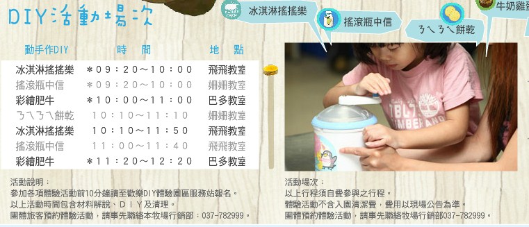 下個月又要去旅行了,所以快快手寫個台灣遊記吧。 這是一次意外的旅程。 說是意外,因為這完全不在我們的計劃之內。 話說某天有朋友說她會在復活節跟兒子去台灣苗栗的 “ 飛牛牧場” ,因為她已經計劃好一切,於是我沒有細想就說我也去吧。 於是,叫朋友替我訂機票,我自己到 “ 飛牛牧場” 的網站訂房,完成。 去旅行當然開心,但是旅行前的安排、訂票、格價、選酒店 …… 對我來說好折騰,所以有朋友安排好一切我照跟,節省很多心力,真好。 然後剛過去的復活節我們一家三口跟朋友一家三口一起旅行去。 四日三夜的復活節旅行,兩晚住在 “ 飛牛牧場” ,一晚住在台北,既有親親大自然的親子活動,也有閒遊逛書店到處覓食的行程,輕鬆又好玩。 如果不是有女兒,我大概絕對不會考慮到牧場旅行吧。 但既然今後的旅行(至少在她拒絕之前)都打算跟女兒同行,自然要安排一些適合小孩的活動,而牧場絕對是親子活動的理想場所。 飛牛牧場不算很大,但足夠讓我們一家三口玩得開開心心。 我們在飛牛牧場入住兩晚。 .第一天. 第一天中午乘機由澳門到台中機場,抵達後乘坐預訂好的包車到飛牛牧場,車程大概 40 分鐘,抵達後職員向我們講解園區活動和各項安排,到房間稍微休息後便到牧場到處閒逛。 餵餵金魚、在草地跑跑跳跳、觀賞大自然的景緻、呼吸清新空氣,看看牛群開餐,這些都是在澳門少做之事。 傍晚時份吃過晚餐,沒多久就是 DIY 牛奶布甸時間。 我們按照職員事先調配好的份量,利用牛奶、忌廉和砂糖做出十件牛奶布甸,待職員焗好以後便可以即時品嚐。 女兒幫手搞搞搞,當然是搞亂多一點,但同時學會東西用完後要洗乾淨再放好。 十件牛奶布甸當晚吃不完,拿回房間放入冰箱,往後兩天繼續吃。 PS. 飛牛牧場的房間,連我這種挑剔狂也無可挑剔。不是說房間有多豪華,但是整體乾淨,感覺良好,特別是浴室,簡單整潔。 .第二天. 這天才是行程重點。 望著牧場各項活動的時間表,還真的要好好動腦該怎麼安排行程,最後經商議後,決定早上探訪各種動物,親親大自然,然後再參加 DIY 活動。 原本以為 DIY 活動要另行繳費,但牧場送我們體驗券,於是先報了三個項目。 親親大自然活動,先是看到欄中有一群小羊,旁邊可以自助購買飼草餵小羊。 女兒還小,不敢親自 餵小羊 ,那就由大人出手吧,但她看得頗有興緻。 接著便排隊參加奶小牛喝奶奶的活動。 牧場的工作人員先是向大家講解用奶瓶餵小牛喝奶的技巧,然後向參加者派發奶瓶,一個跟一個 餵小牛喝奶奶 。 女兒當然未有能力控制奶瓶,所以爸爸一手抱著她,一手餵小牛喝奶,過程大概 15 秒吧,女兒還未弄清楚發生甚麼事就完結了。 接下來將有鴨 BB 大遊行,但趁活動之前,我們先 餵小鴨子 ,這次女兒敢餵了,將飼料放在膠碗中,一群小鴨子洶湧而至,迅間將飼料吃光光。因為小鴨子實在可愛,所以女兒餵完一次又一次。 鴨 BB 大遊行 其實都是長大了的鴨子,不是鴨 BB ,但不打緊,一大群鴨子同時衝向人群還真有吸引力,鴨子不懂表演,只是會走來走去,或聽到鈴聲,或被飼料吸引,但這已足以為大家帶來歡樂。工作人員向觀眾派發飼料,大家都伸手接過,然後拋到地上餵鴨子。女兒拋下一把又一把,鴨子就在我的腳跟前吃個不停。 跟鴨子說再見後,還可以試試餵小羊喝奶奶,吃飼草,再走上一段路到 兔寶寶的家 ,餵兔子吃菜,又可以試騎小馬兜圈。 女兒不敢餵兔子,也對騎小馬沒興趣,我們於是躺在草地上,休息的休息,奔跑的奔跑。 本來還可以試玩擠牛奶,但因為排隊人數眾多,最後放棄了,吃過軟雪糕後便出發去乘坐遊園車 “ 飛牛一號” ,乘車遊覽園內各處,包括 蝴蝶園 ,賞花賞蝶。 吃過午飯後先參加了兩場 DIY 活動,“ 冰淇淋搖搖樂 ” 和“ 彩繪肥牛 ” 。 “ 冰淇淋搖搖樂 ”就是自製雪糕,工作人員已將所有材料份量分配好,我們只是按指示放入材料,然後搖搖搖,好像搖了十多分鐘才有成果,期間女兒想幫手,但總是越幫越忙,最後搖太久她也失去興趣,就爸爸媽媽接力。之後即場吃雪糕當然是重點,吃完還得自行清潔所有工具。這概念很好。 “ 彩繪肥牛 ”是將水彩塗在一隻小小的瓷牛上,開始的時候還好,後來女兒搶著要自己塗,於是肥牛變黑牛,本來我們想力挽狂瀾,但後來心想,任她玩吧,女兒享受的是塗上顏料的過程,我們何必執著於塗完後的製成品呢? 玩完後便要午睡了,本來之後還安排了 “ 搖滾瓶中信” ,但是因為女兒剛睡不久,所以便沒有參加。 睡飽飽以後已近黃昏,到小商店買買手信,到兒童遊樂場玩玩滑梯、氹氹轉、玩玩沙,然後便吃 牛奶火鍋 做晚餐,回程看看天上的星星,完美地結束一天的活動。 PS. 牧場每天送我們鮮奶兌換券,可以換原味或麥芽味牛奶,麥芽味好味道。 (飛牛牧場網址: http://www.flyingcow.com.tw/ ) 睡飽飽以後已近黃昏,到小商店買買手信,到兒童遊樂場玩玩滑梯、氹氹轉、玩玩沙,然後便吃牛奶火鍋做晚餐,回程看看天上的星星,完美地結束一天的活動。 PS. 牧場每天送我們鮮奶兌換券,可以換原味或麥芽味牛奶,麥芽味好味道。 (飛牛牧場網址:http://www.flyingcow.com.tw/) .第三、四天. 第三天預約了 11 點包車直接出台北。 因為昨晚女兒主動提出想再看一次鴨 BB 大遊行,所以便趁出發前再去玩一次遊樂場、餵兔子和小鴨,再看一次鴨 BB 大遊行。 女兒很開心啊,然後便乘車去台北。 她跟我一樣,