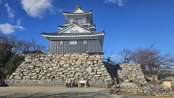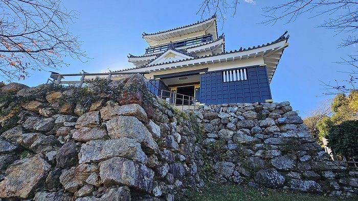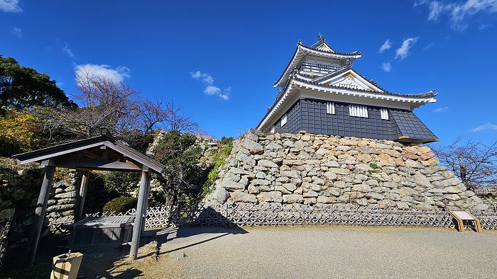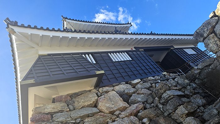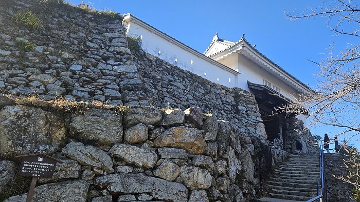 各種大小未經過切割的原石堆疊的天守台,石垣採用自然石直接堆砌的「野面積」技法,經歷400年的歲月,至今仍保留著當時的風貌。