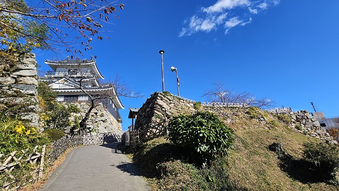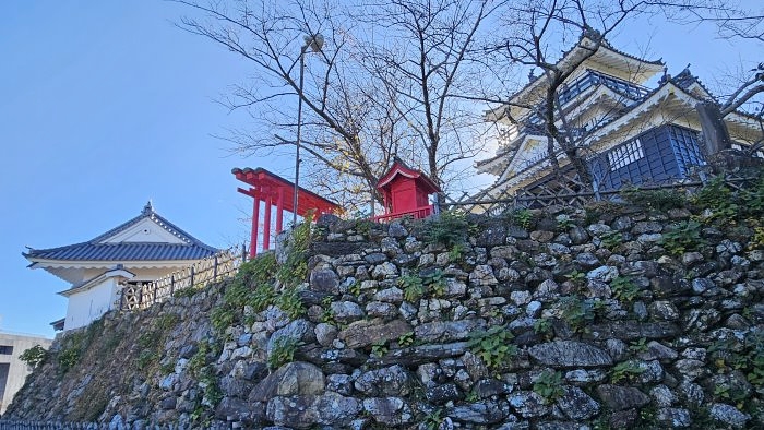 自本丸仰望天守曲輪下方的石垣、天守門、鳥居、稻荷神社與天守閣。