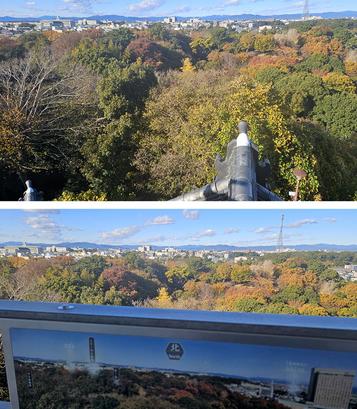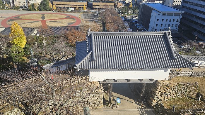 俯瞰天守門,左方銀杏樹旁有「家康公銅像」。