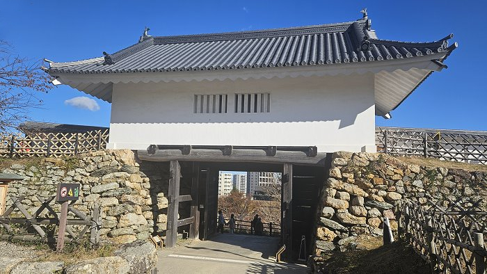 天守門,高9.4公尺、寬11公尺、深5公尺,最初建於安土桃山時代,於1873年被拆除;之後經過2000年代的考古發掘調查,於2014年復原為現今的樣貌。