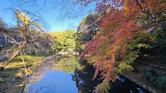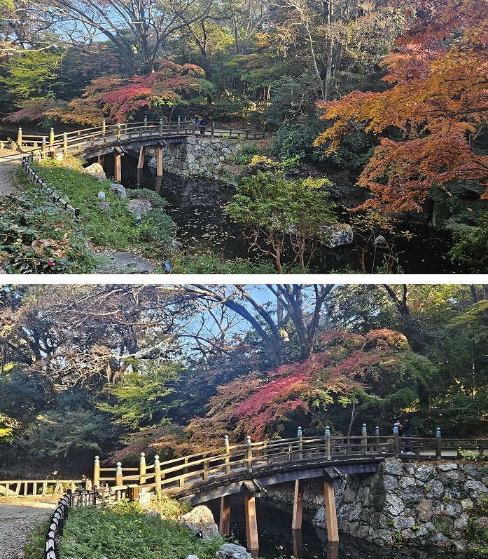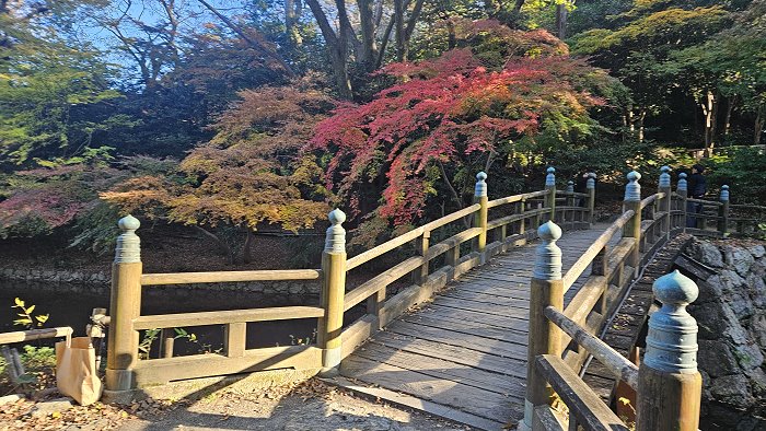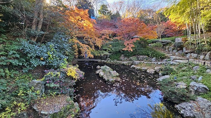 紅葉、竹林、石橋與疊石等元素,構成和風美學的庭園造景。