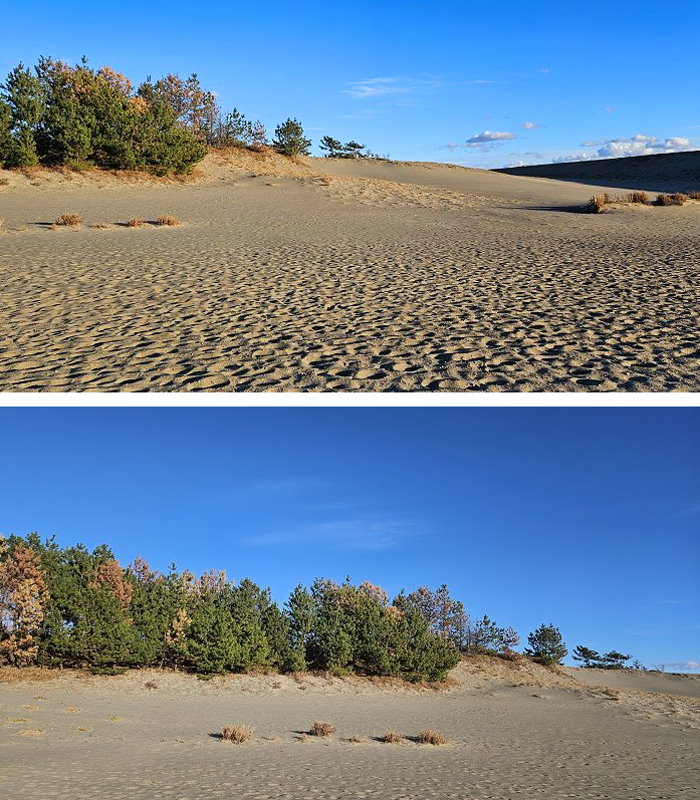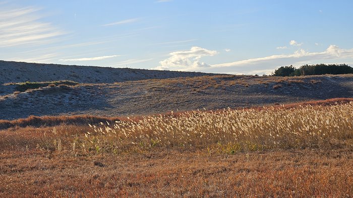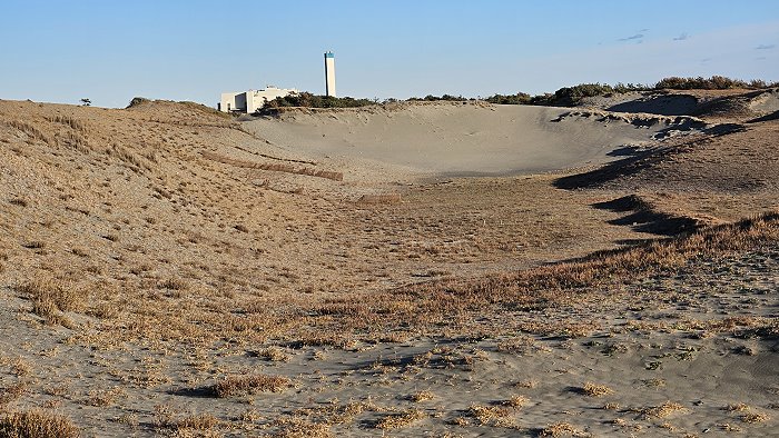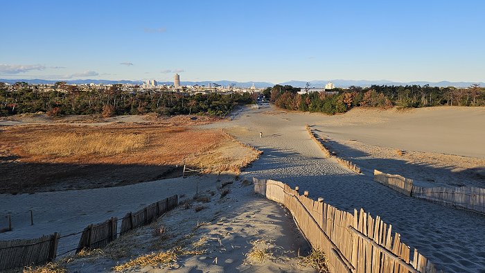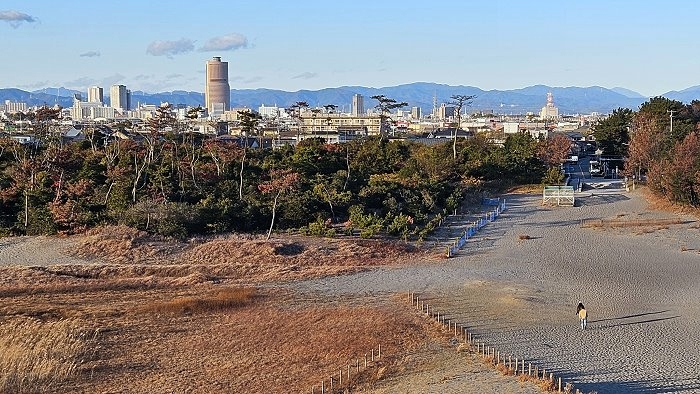 展望中田島砂丘約有千年歷史的「浜堤(沙脊)」。這裡所在的區域曾經是海底,但大約10萬年前,海平面發生變化,地形逐漸形成,最終形成的六道沙脊,中田島砂丘就位在距今約1000年所形成的最後一道沙脊之上。