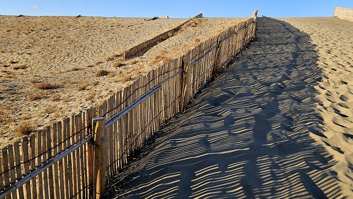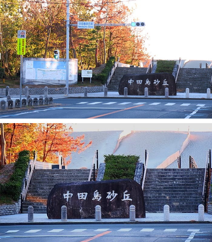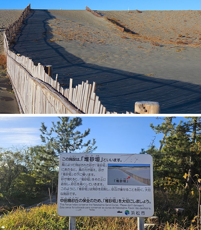 堆砂垣(たいさがき),為竹編的堆砂柵欄,是為了防止沙子流失並保持砂丘的形狀;當強風吹來的沙子撞擊到這道柵欄時,沙子會堆積在周圍地區,有助於保護砂丘,防止砂丘面積縮小。