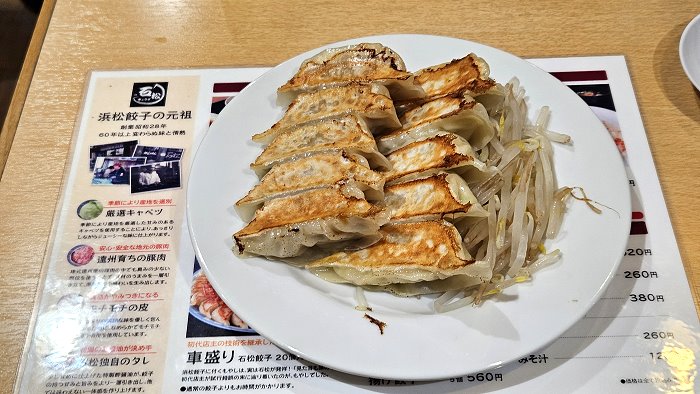 當時僅單點了招牌石松煎餃和肉餃子兩種口味各5個(2025年12月價格為880日元),沒有以「車盛り」的方式排成圓形,還是附有一撮燙熟的豆芽菜。個人覺得嘗起來味道就是很普通,並未感到特別美味。