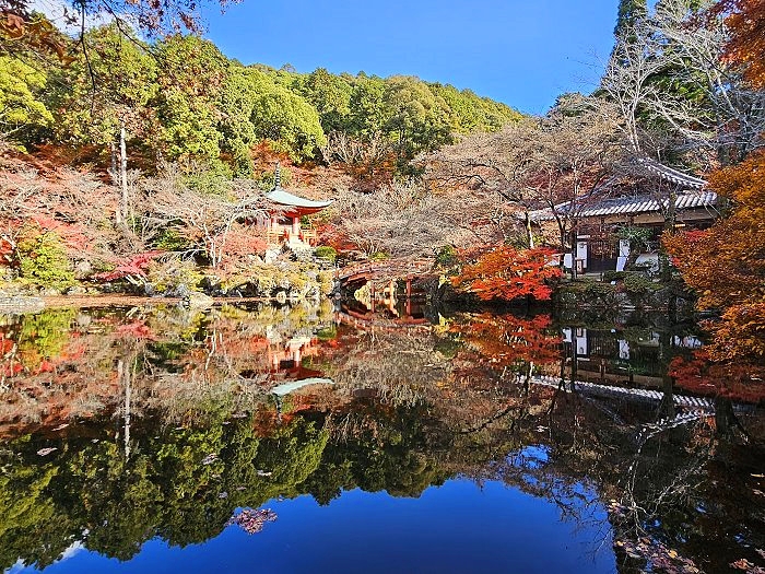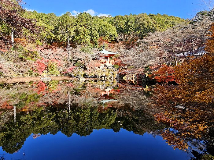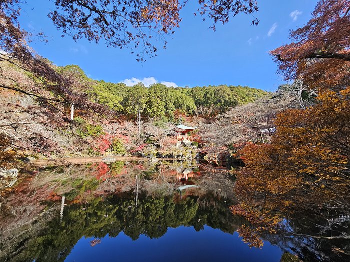 從觀音堂眺望弁天池,這裡紅葉美景是醍醐寺最知名的紅葉賞景處。