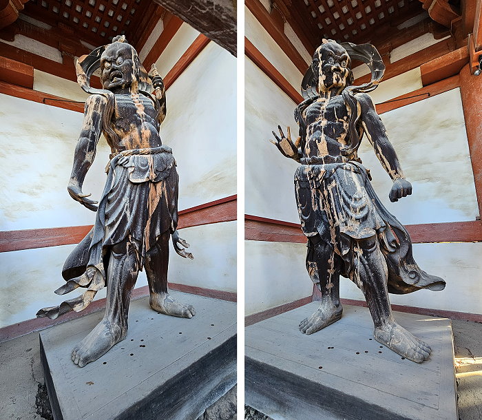 「阿」與「吽」兩尊氣勢威嚴的仁王像分立於西大門左右,為長承3年(1134年)由佛像師勢増和仁増所造立。仁王像不怒自威的握拳姿態及壯碩的肌肉線條,則是鎌倉時代後常見的仁王像特徵;最早設置於已不復存在的南大門,日後才遷至西大門。