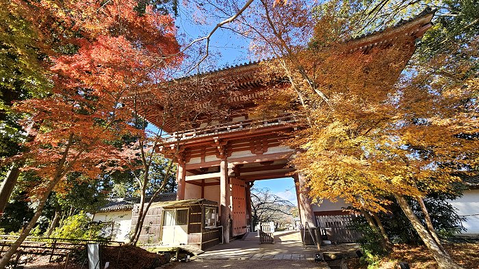 紅葉掩映西大門(仁王門)。左側小木屋為拜觀券販所,若沒買「醍醐寺3景點通票」,要觀覽「下醍醐」伽藍則另需購票。 醍醐寺參觀訊息詳見官網:https://www.reurl.cc/Dagoji