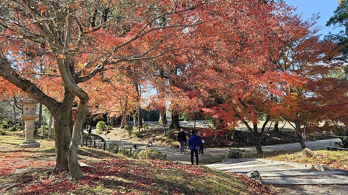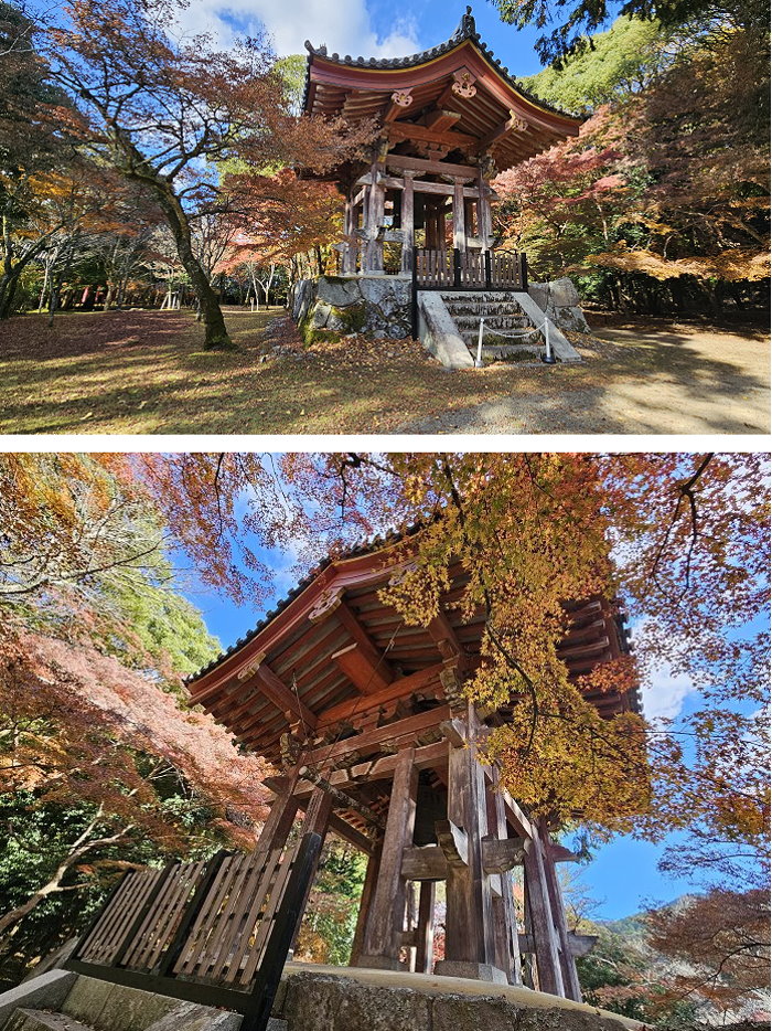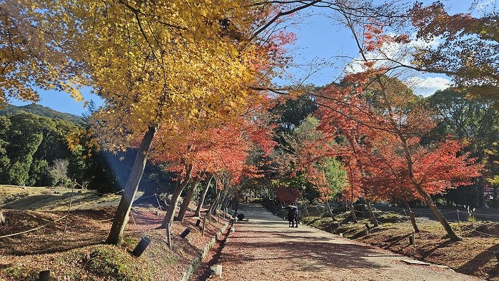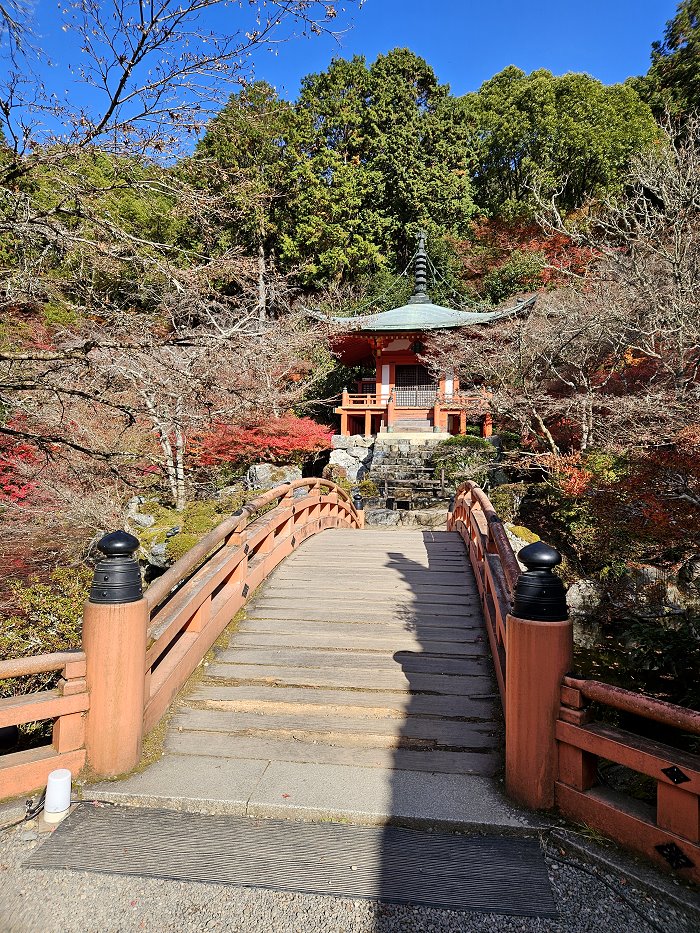 連接西大門與金堂的參道,紅葉斑斕。 ↑圖樹下人影是來自小小多山的國家幾位年輕人,在下醍醐伽藍重點區域都聽得到他們大呼小叫的指點站位及討論要去吃什麼,影響古剎境內寧靜毫無自覺,簡直丟臉丟到國外來了!