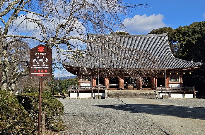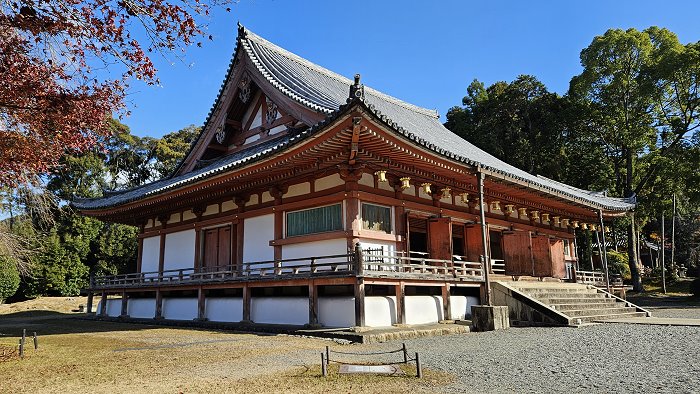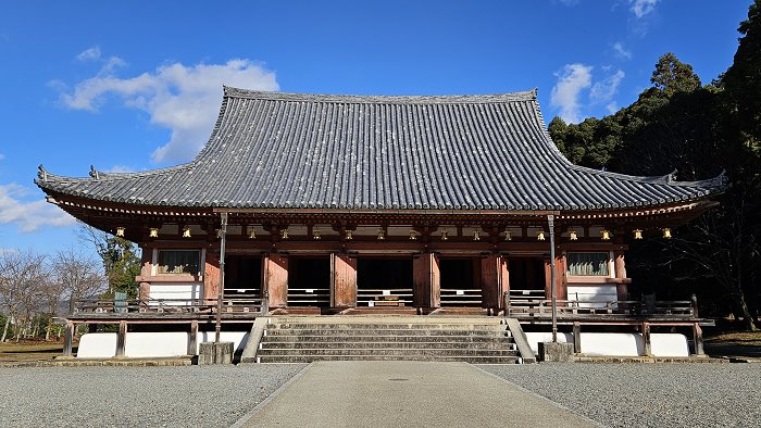 金堂初建於延長4年(926年),為入母屋造本瓦葺,入母屋屋根為近世移築時所修建;正面有7開間(20.8公尺),兩側各有5開間(17.4公尺),是平安時代後期現存最大的建築。 大殿的獨特之處在於內外殿之間沒有任何隔間或屏障,形成一個統一的整體空間,殿內供奉藥師如來坐像,日光菩薩與月光菩薩隨侍左右,另有隨金堂一同遷入的四大天王守護神像(正殿內部禁止攝影)。