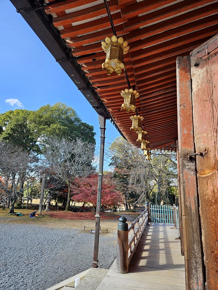 金堂廊下眺望,有工作人員正在辛勤整理環境。