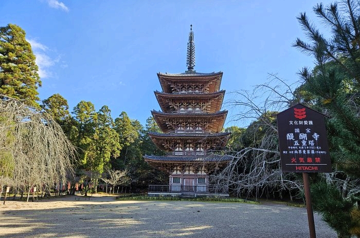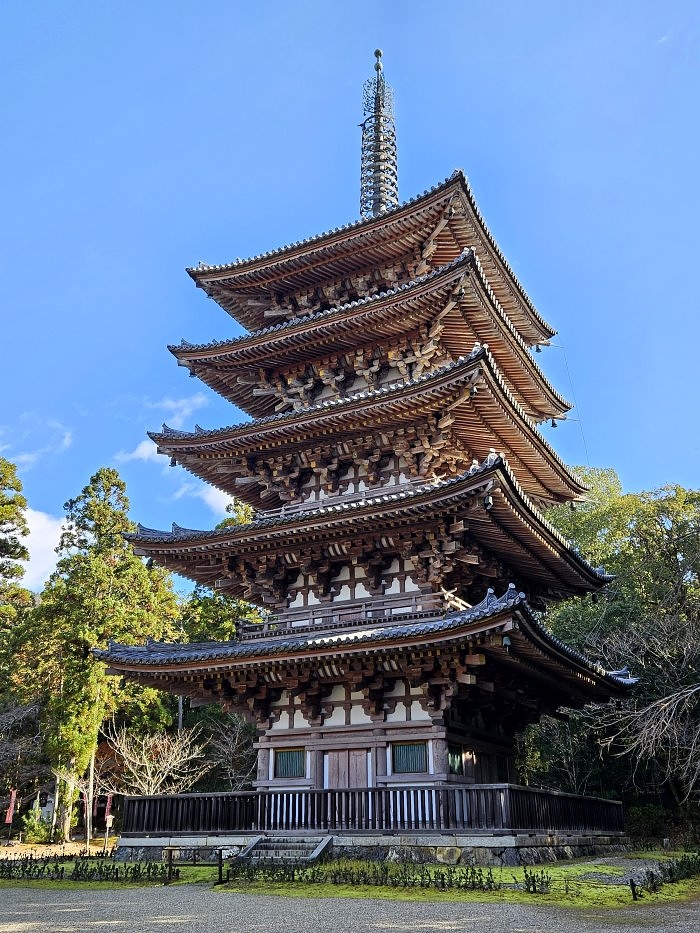 五重塔為方形五層樓閣式木塔,總高38公尺,其中塔頂的相輪高12.8公尺,約占全塔高度的三分之一;塔身由下往上逐層縮減,建築結構兼具厚重與洗練美感,造型沉穩優雅,盡顯平安時代佛塔莊嚴肅穆之風格。 五重塔高12.8公尺的相輪(塔頂上方的金屬部分)特寫。