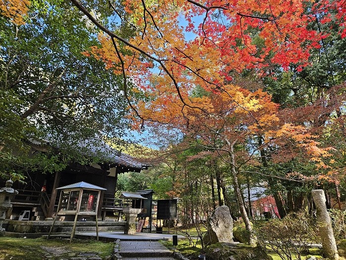 日月門之後,觀音堂旁林葉參天,楓紅層層秋色繽紛。