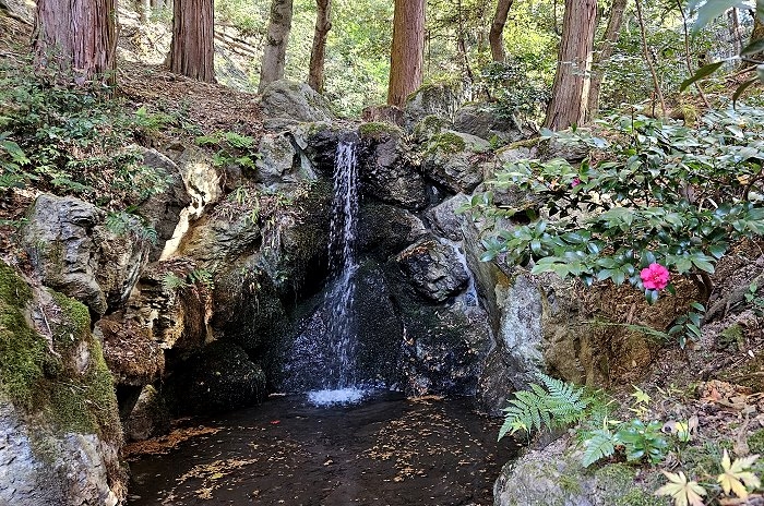 林泉間苔岩構成曲折水道,盡頭一縷飛瀑,這裡是弁天池源頭。