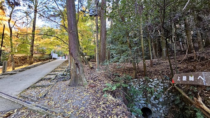左側為「成身院(女人堂)」,位於通往上醍醐的登山口,由於古時候女性從此處登山參拜山上的諸佛,從而通稱為「女人堂」;右側關東旗後方就是上醍醐的登山口。