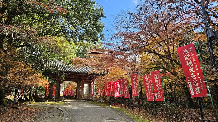 醍醐寺境通往觀音堂參道,沿途插滿「准胝堂西国三十三所札所」的關東旗。
