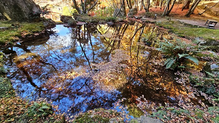 紅葉林間砌石曲水。